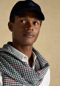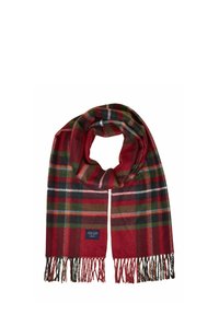 Černobílá šála s vzorem psí zub a červenými a zelenými károvanými liniemi, smotaná s třásněmi na bílém pozadí.
