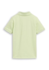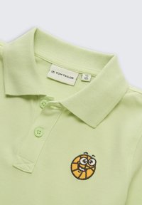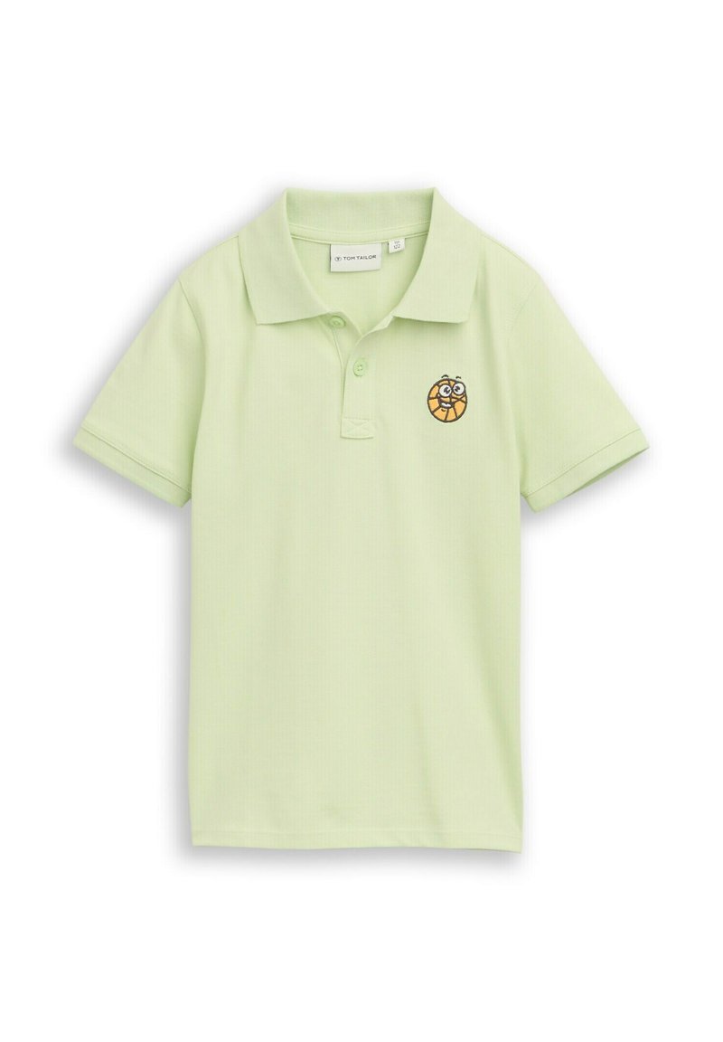 Světle zelené polo tričko s krátkými rukávy, límcem, dvěma knoflíky a malým vyšitým kresleným basketbalovým míčkem na levé straně hrudi.
