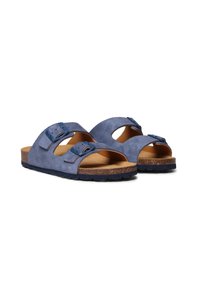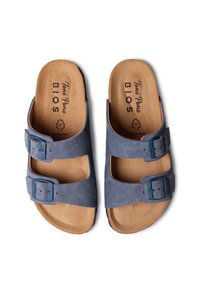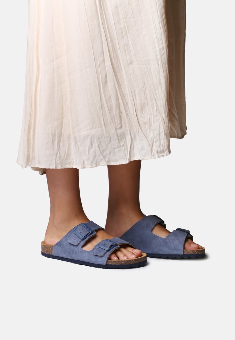 Modré semišové sandály se dvěma nastavitelnými přezkami, korkovou stélkou a texturovanou gumovou podrážkou. Nošené s dlouhou, splývavou sukni krémové barvy.