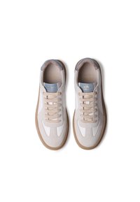 Béžové a bílé tenisky s panely z semiše a kůže, disponující strukturovanou hnědou podrážkou a světle modrými akcenty na patě.