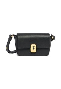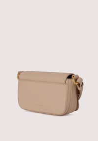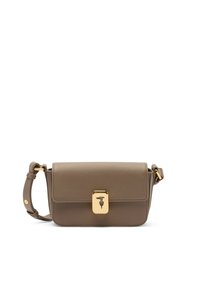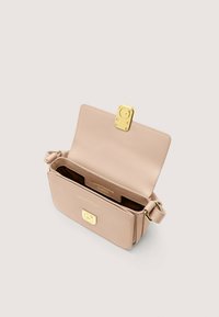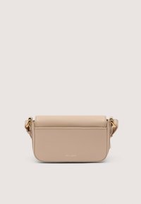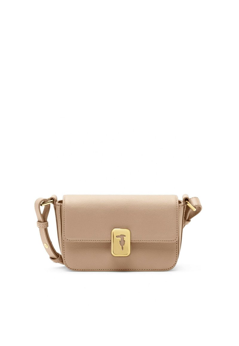 Béžová kožená crossbody kabelka s nastavitelným popruhem a zlatým obdélníkovým zapínáním na předním klopu.