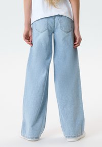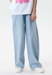 Dospívající dívka se usmívá, má na sobě bílé tričko s grafikou Stitch a světle modré široké džíny s malými puntíkovanými vzory a bílé tenisky.