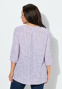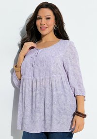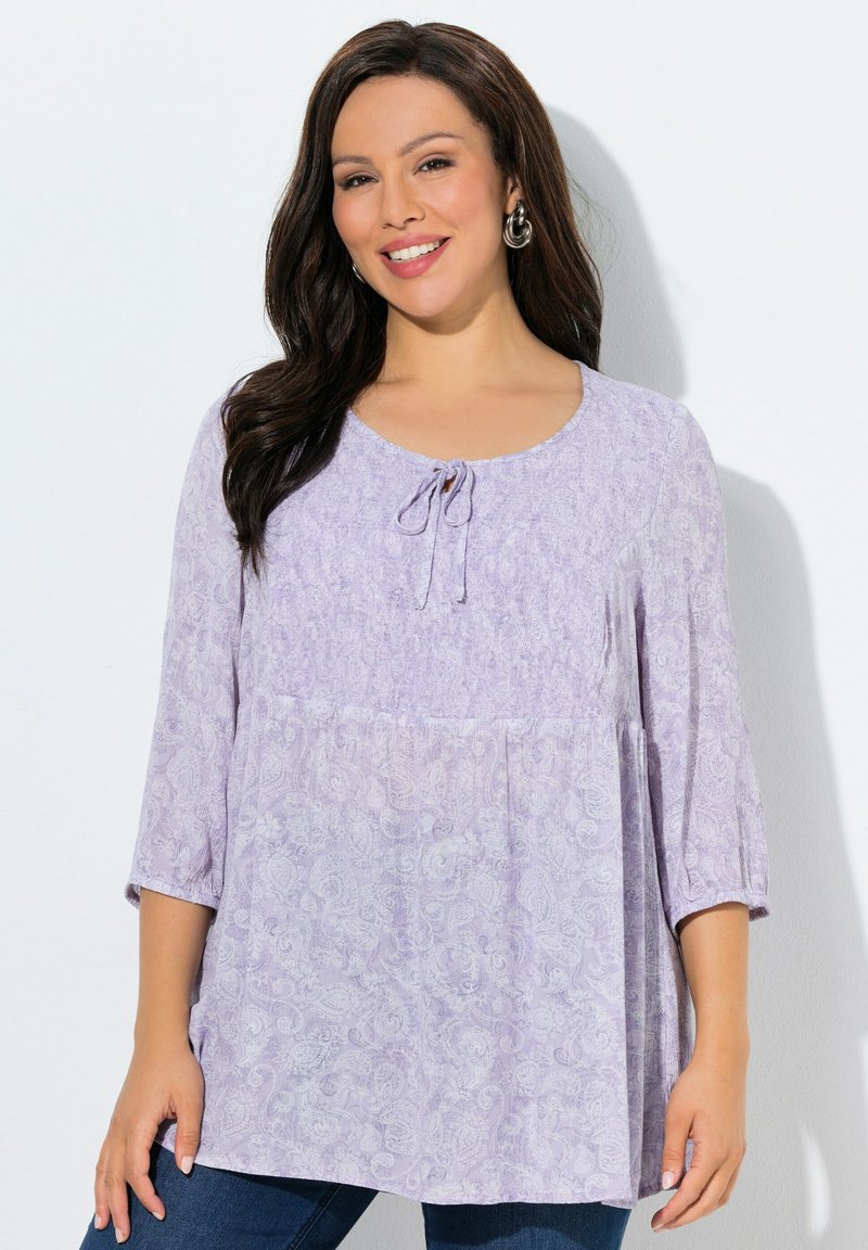 Žena se usmívá, má na sobě světle fialovou halenku s paisley vzorem, třičtvrtečními rukávy a vázáním u výstřihu, a tmavě modré džíny, stojí na bílém pozadí.
