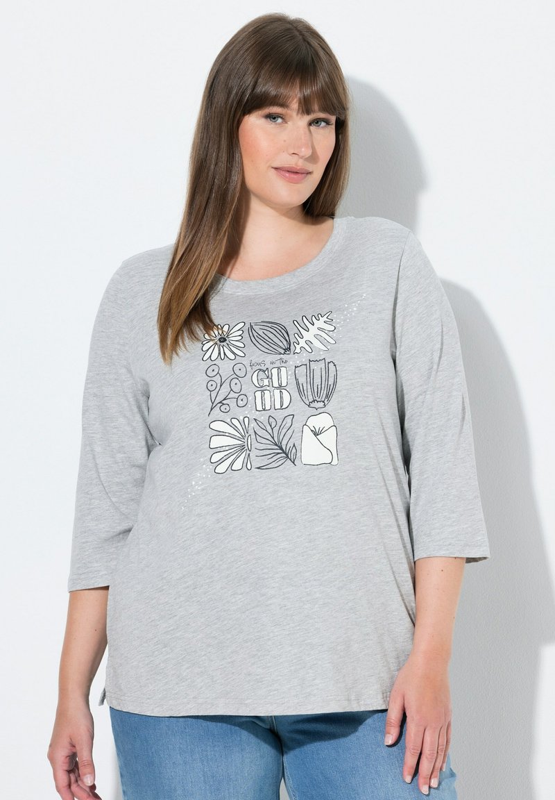 Šedé bavlněné tričko s tříčtvrtečními rukávy, s černým obrysem květinového a geometrického vzoru na přední straně. Volný střih.