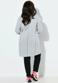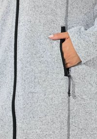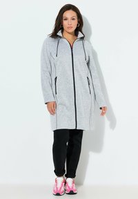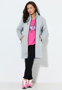 Žena v světle šedém kabátě na zip, černých kalhotách a růžovo-bílých teniskách, stojící před jednoduchým světlým pozadím.
