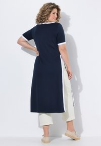 Žena s kudrnatými vlasy v tmavě modrých midi šatech s bílým lemováním a bočními rozparky, v kombinaci se světlými kalhotami a béžovými teniskami.