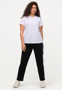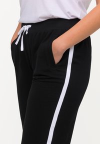 Osoba nosící černé tepláky s bílými bočními pruhy, bílým stahovacím šňůrkem a bílými teniskami, stojící proti jednobarevnému bílému pozadí.