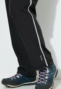 Osoba nosící tmavě modré kalhoty na stažení s boční kapsou na zip a reflexním pruhem, doplněné o turistické boty a pruhované tričko.