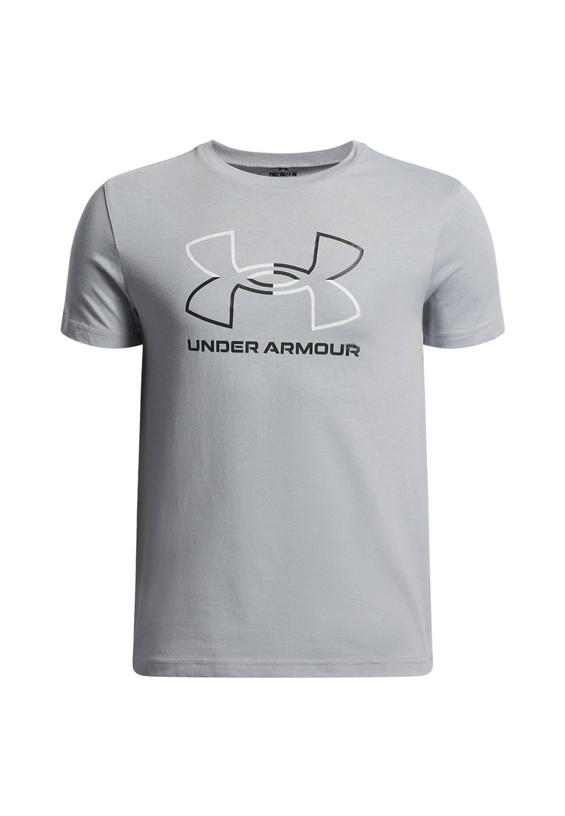 Světle šedé bavlněné tričko s černobílým logem Under Armour na přední straně, krátké rukávy a kulatý výstřih.