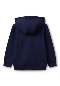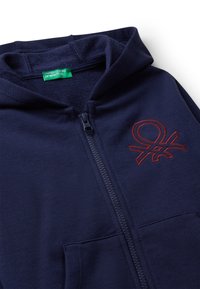 Námořnická modrá mikina na zip s předními kapsami, žebrovanými manžetami a červeným vyšívaným logem na levé hrudi.