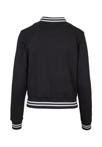 Olivově zelená bomber bunda s kovovými druky, žebrovaným límcem a manžetami a bílými pruhy. Měkká tkanina a přiléhavý střih.