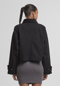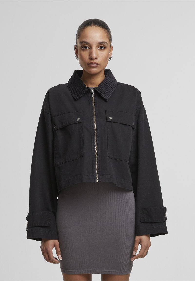 Oříznutá černá džínová bunda s manšestrovým límcem, dvěma náprsními kapsami a širokými rukávy. Má stříbrné kovové doplňky a přední zapínání na zip.