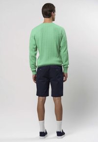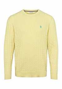 Světlounce zelený svetr s kabelovým vzorem, který má žebrované manžety a lem, s malým modrým logem na hrudi. Materiál vypadá měkký a texturovaný.