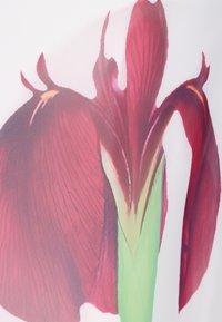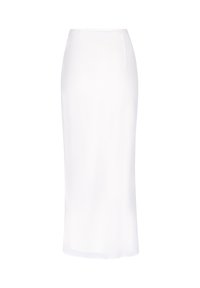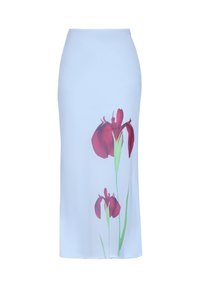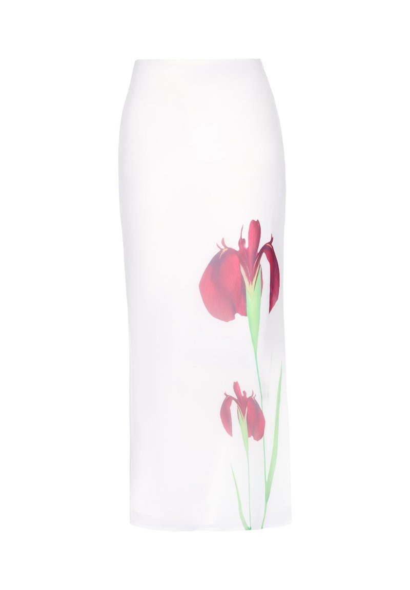 Bílá sukně tužkového střihu s potiskem červených květů kosatce na spodní straně, s zelenými stonky a listy.