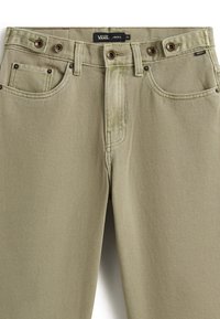 Kháki krátké kalhoty Vans ve dĺžce po kolena s poutky na pásek, předním zapínáním na knoflík a zip a designem s pěti kapsami na bílém pozadí.