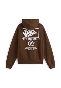 Hnědá mikina s bílým logem a textem na zádech. Má kapuci se šňůrkou a spadlé ramena, nošena přes pruhované tričko.