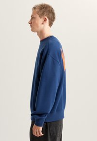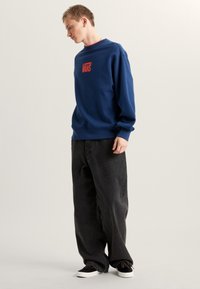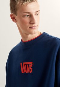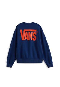 Modrá mikina se svolným střihem a velkým červeným logem "VANS" na zádech. Design má pohodlný střih s žebrovanými manžetami a lemem.