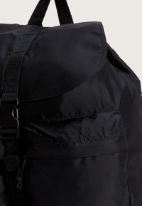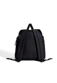 Černý nylonový batoh s překlápěcí klopou, vybavený dvěma předními kapsami a nastavitelnými popruhy, nošený osobou v bílém tričku.