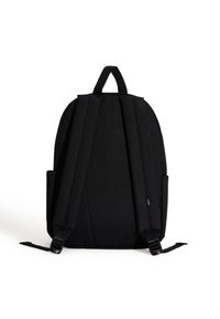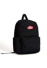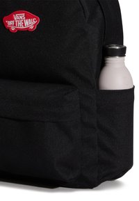 Černý plátěný batoh s kulatým tvarem, přední kapsou a červenou nášivkou s logem "VANS OFF THE WALL". Nastavitelné popruhy nahoře.