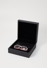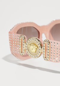 Růžové sluneční brýle s texturovaným rámem, zdobené rhinestony podél okrajů a zlatými kovovými prvky na spáncích. Gradientní skla.