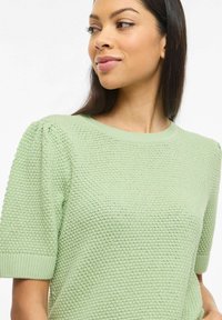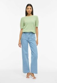 Světlý zelený pletený svetr s texturovaným vzorem, krátkými rukávy a kulatým výstřihem, v kombinaci s džínami s vysokým pasem světle modré barvy.
