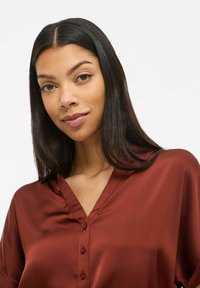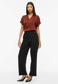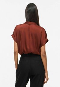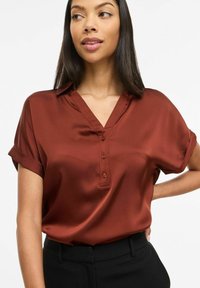 Saténová halenka barvy rezavé s výstřihem do V a légu s knoflíky. Krátké ohrnuté rukávy, hladká textura a kombinována s černými kalhotami.