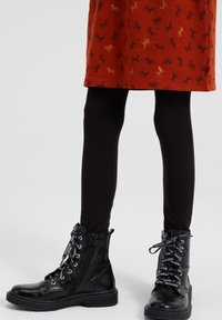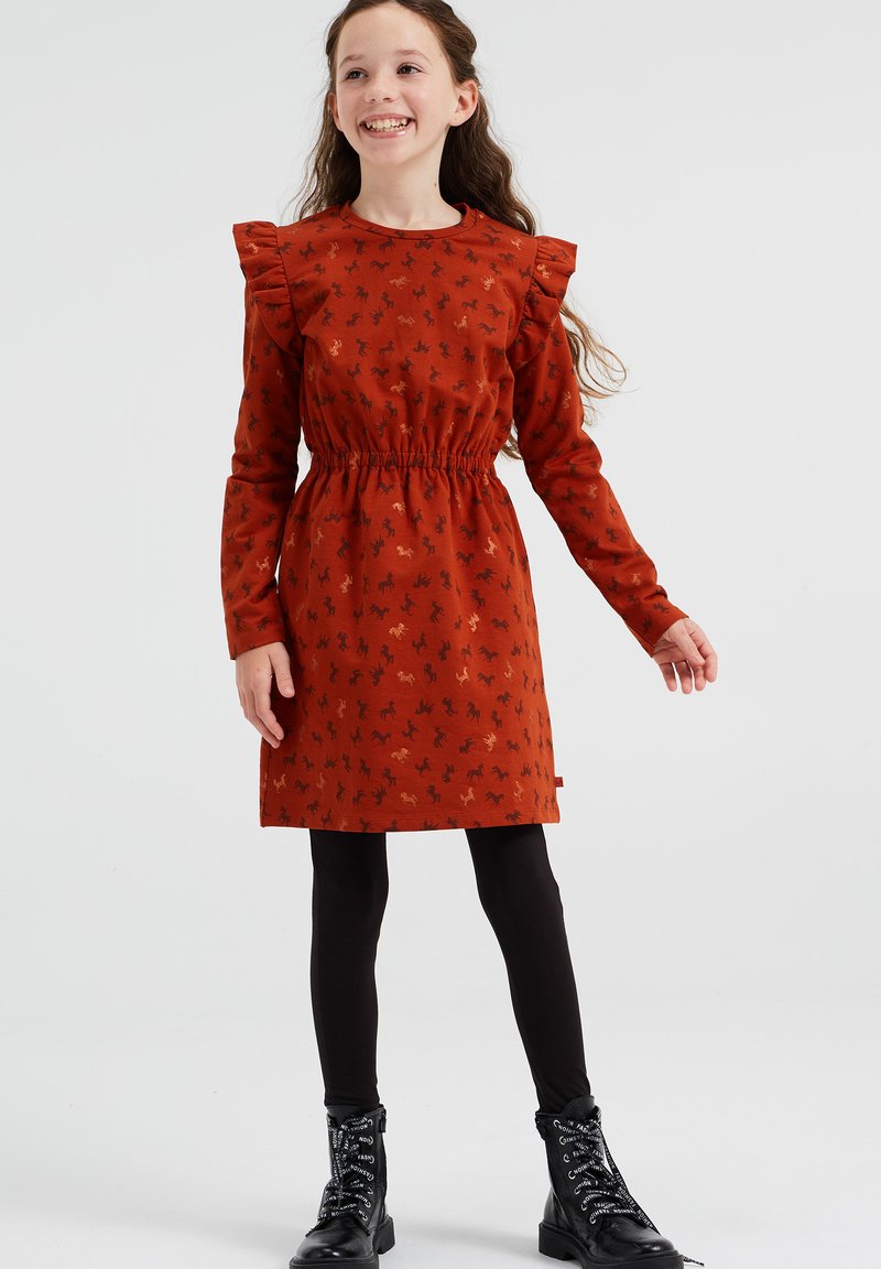 Dívka oblečená v šatách v rustikální barvě s volánkovými rameny a malým zvířecím potiskem, doplněná černými legínami a černými šněrovacími botami.