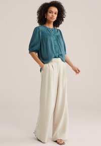 Žena s kudrnatými vlasy, oblečená v tyrkysovém topu s krajkovou lemovkou a béžových kalhotách s vysokým pasem, rukama v kapsách, neutrální pozadí.