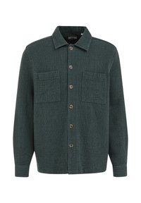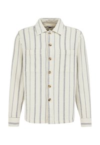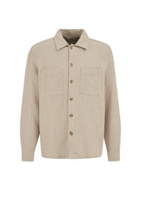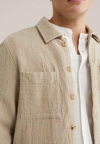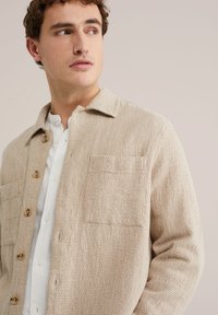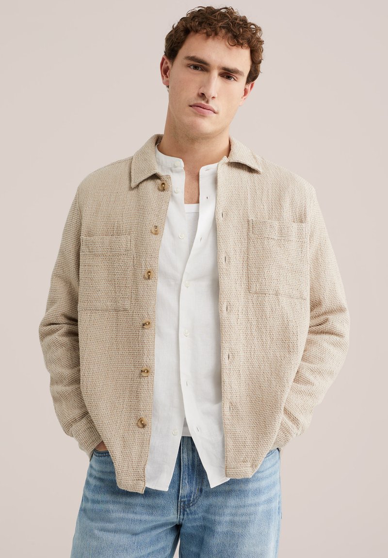 Mladý muž s kudrnatými vlasy nosí texturovanou béžovou bundu na knoflíky přes bílou košili a modré džíny, stojí s rukama v kapsách.