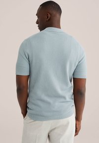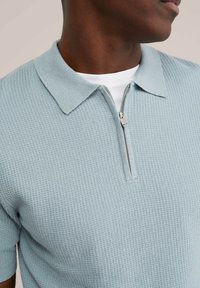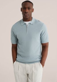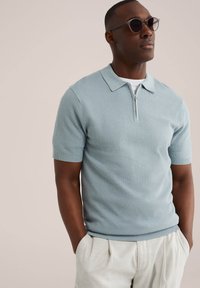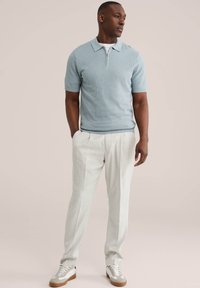Muž v světle modrém pleteném polo tričku s krátkým rukávem a zipem, v kombinaci se světle béžovými plisovanými kalhotami, stojící s rukama v kapsách.