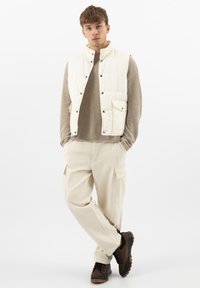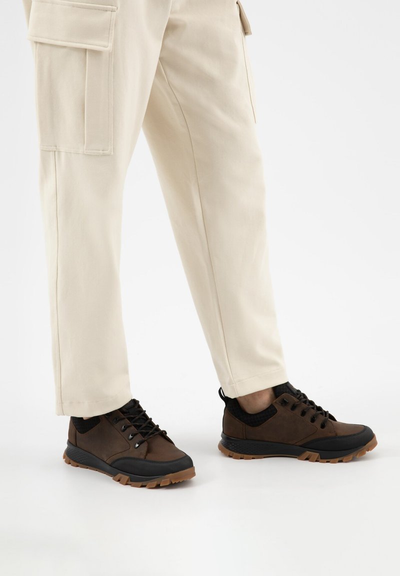 Osoba v béžových cargo kalhotách a hnědých turistických botách s černými podrážkami a tkaničkami, stojící na bílém povrchu.