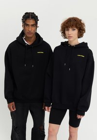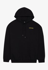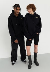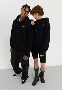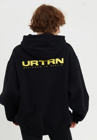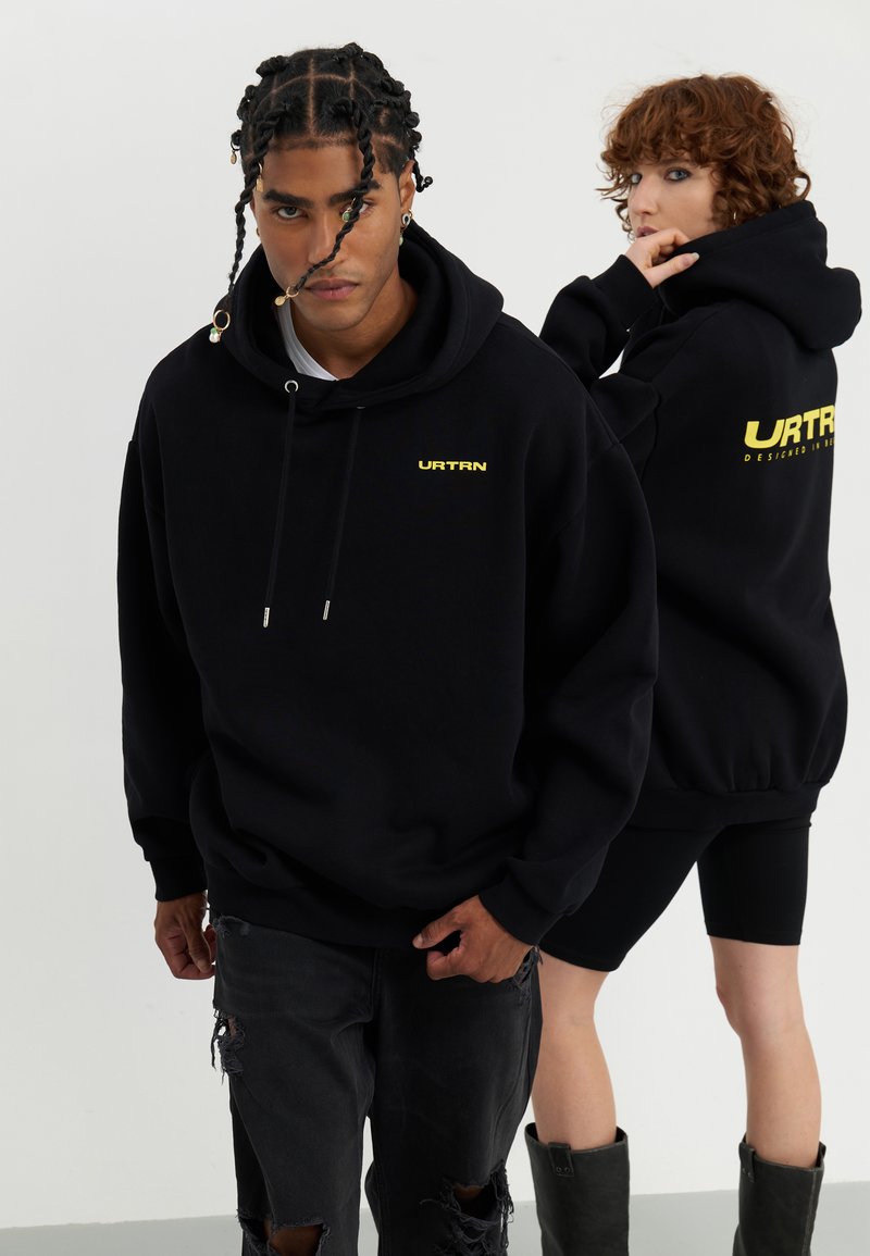 Černé mikiny s žlutým logo "URTRN" na přední straně. Obsahuje šňůrky, volný střih a je kombinována se sepranými černými džíny a vysokými botami ke kolenům.